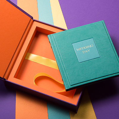 Так же как и в прямоугольной схеме сложно достичь баланса тетроды тонов, особенно если цвета взяты в равной пропорции. Подбирая переплётные материалы для оформления комплекта фотокниги и фотобокса, необходимо следовать уже известному правилу - отдать предпочтение одному цвету и использовать его в качестве фона, а другие в качестве акцентов.